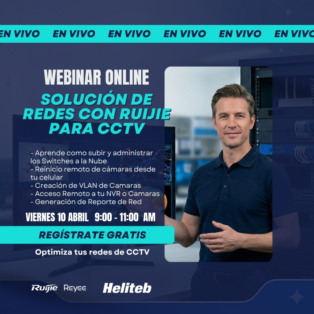 Webinar online Solución de Redes con Ruijie para CCTV, donde aprenderás a configurar, administrar y optimizar infraestructuras de red para sistemas de videovigilancia, integrando switches en la nube, gestionando VLAN de cámaras, accediendo remotamente a NVRs y generando reportes de red de forma eficiente. Dirigido a técnicos, integradores y empresas de seguridad que desean fortalecer sus conocimientos en redes aplicadas a CCTV, mejorar la gestión remota de sus sistemas y ofrecer soluciones más profesionales, escalables y seguras.